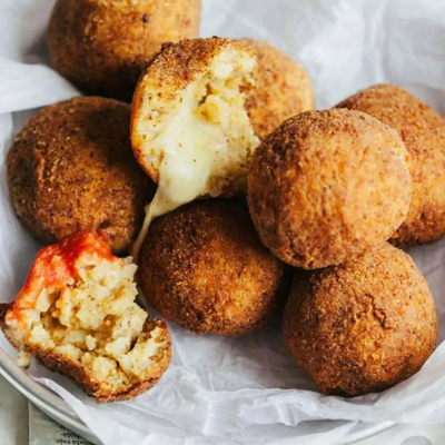 Domates soslu Aracini topları.Domatesin içinde manda sütü ile üretilmiş buffalo mozerellası balzamik yeşil yağ ve pesto ile.