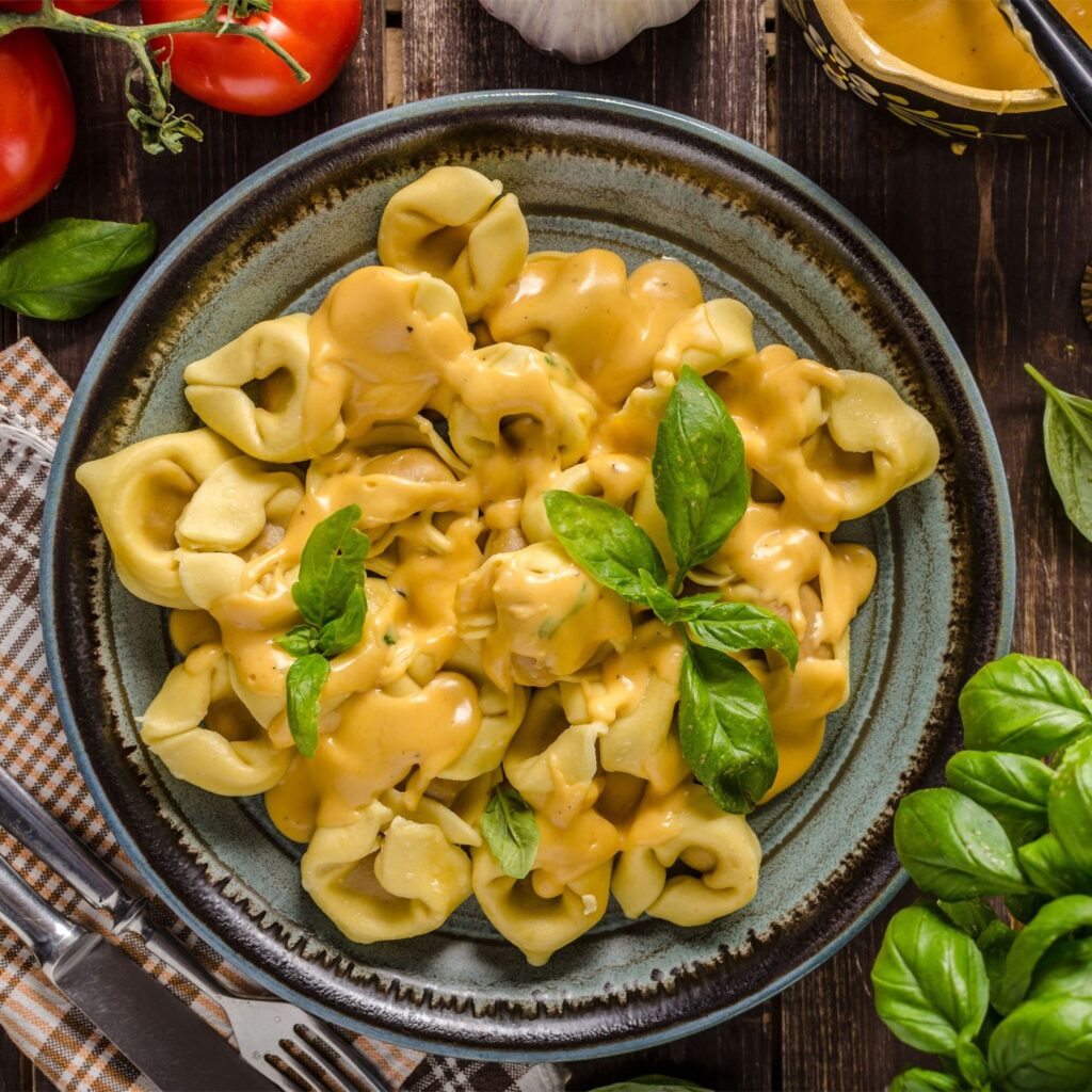 Krema sosu ve dört çeşit peynir ile (gorgonzola,cheddar,parmesan,mozarella)